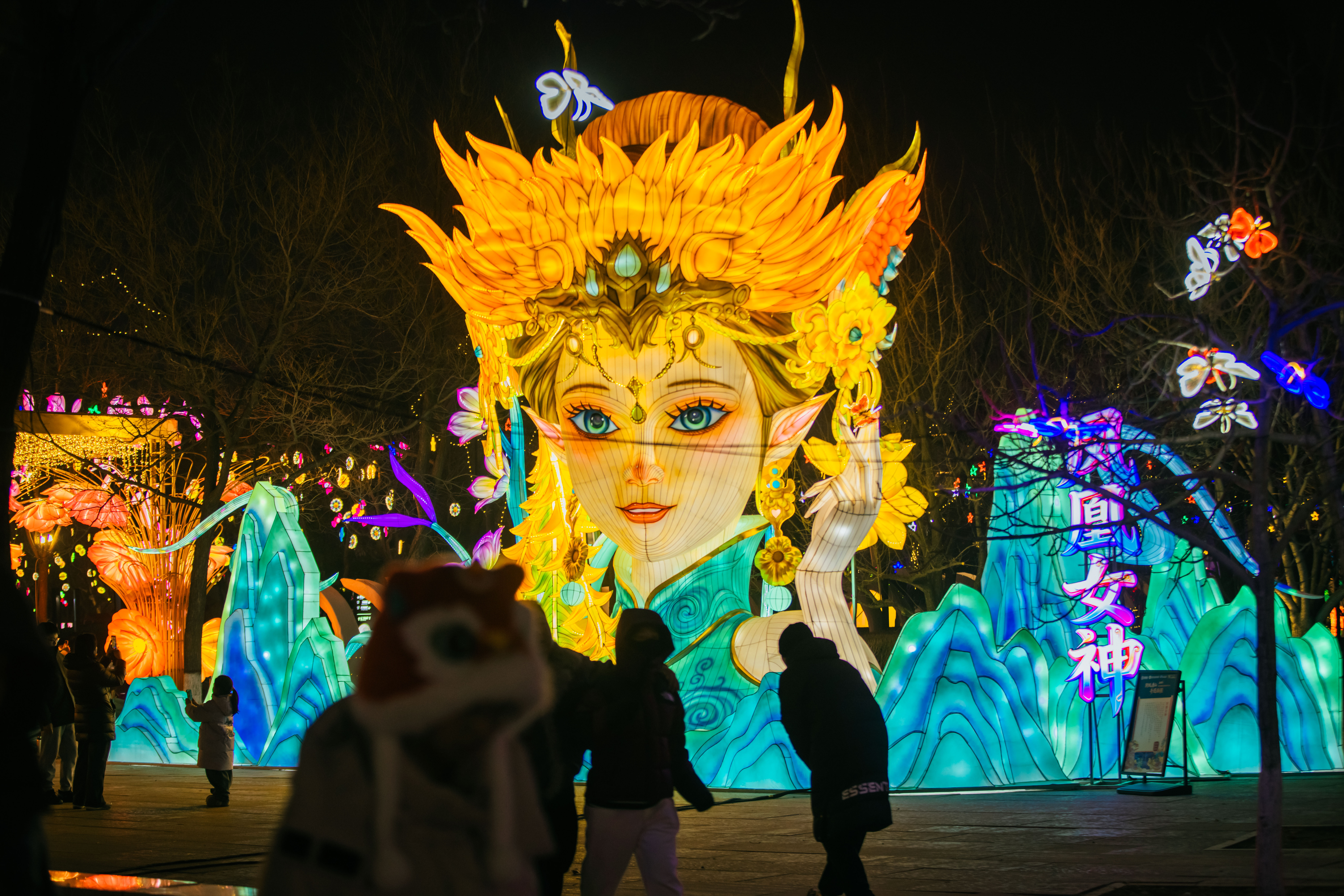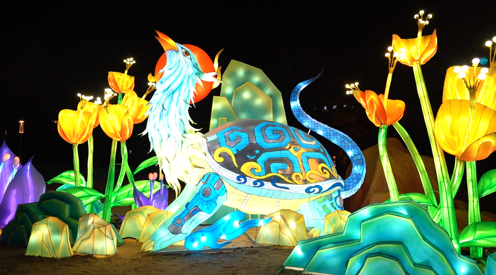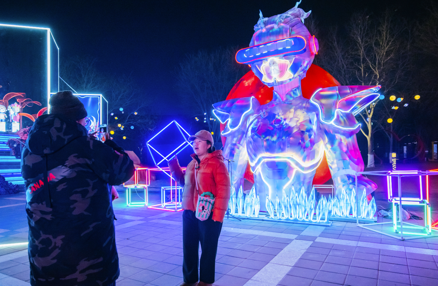 山海狂想主题赏灯区以《山海经》为灵感,打造赛博时空、机甲灵龟、镜面时空、独角兽等一系列科技感十足的灯组,使这里成为赛博朋克与东方神话交融的奇幻秘境。