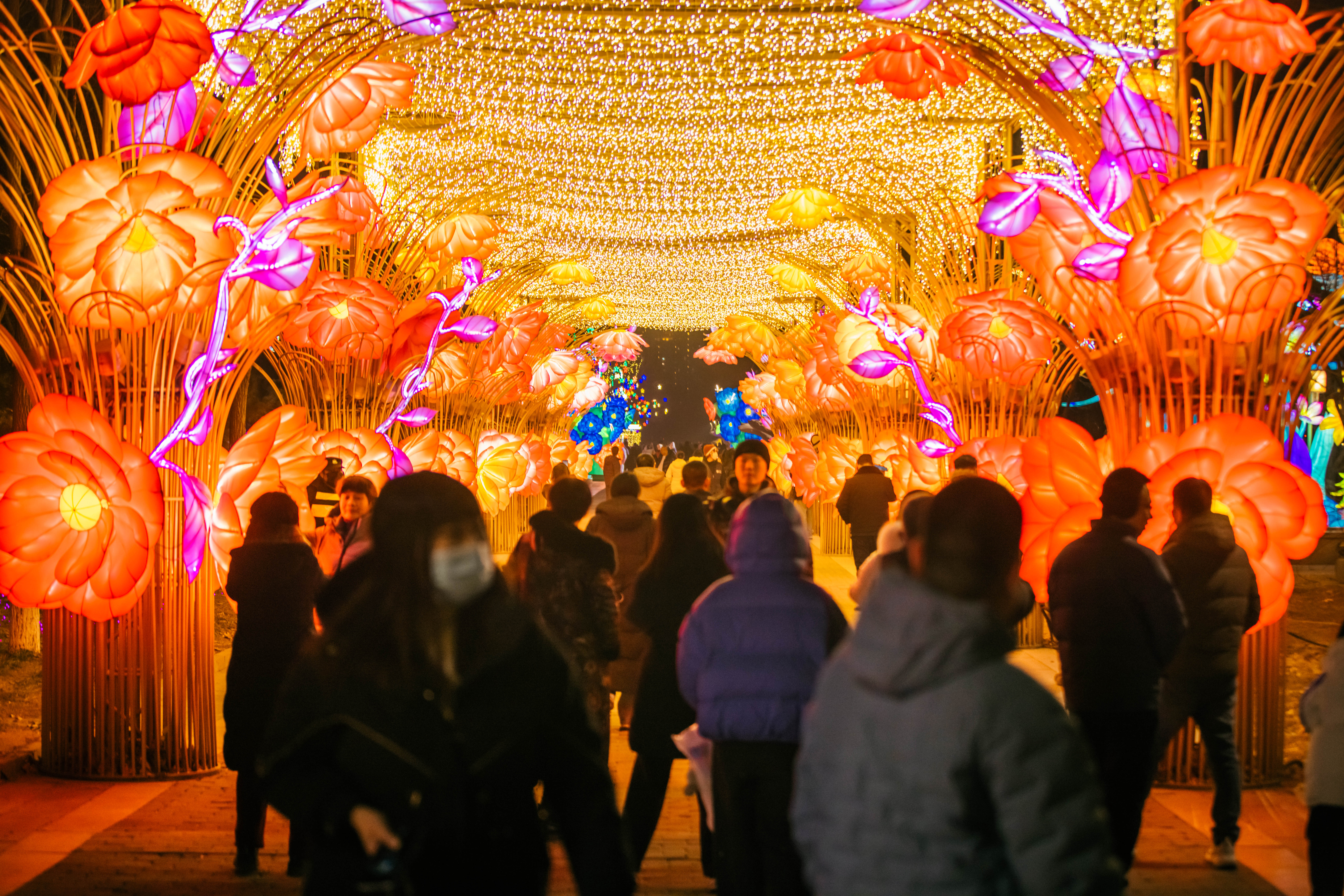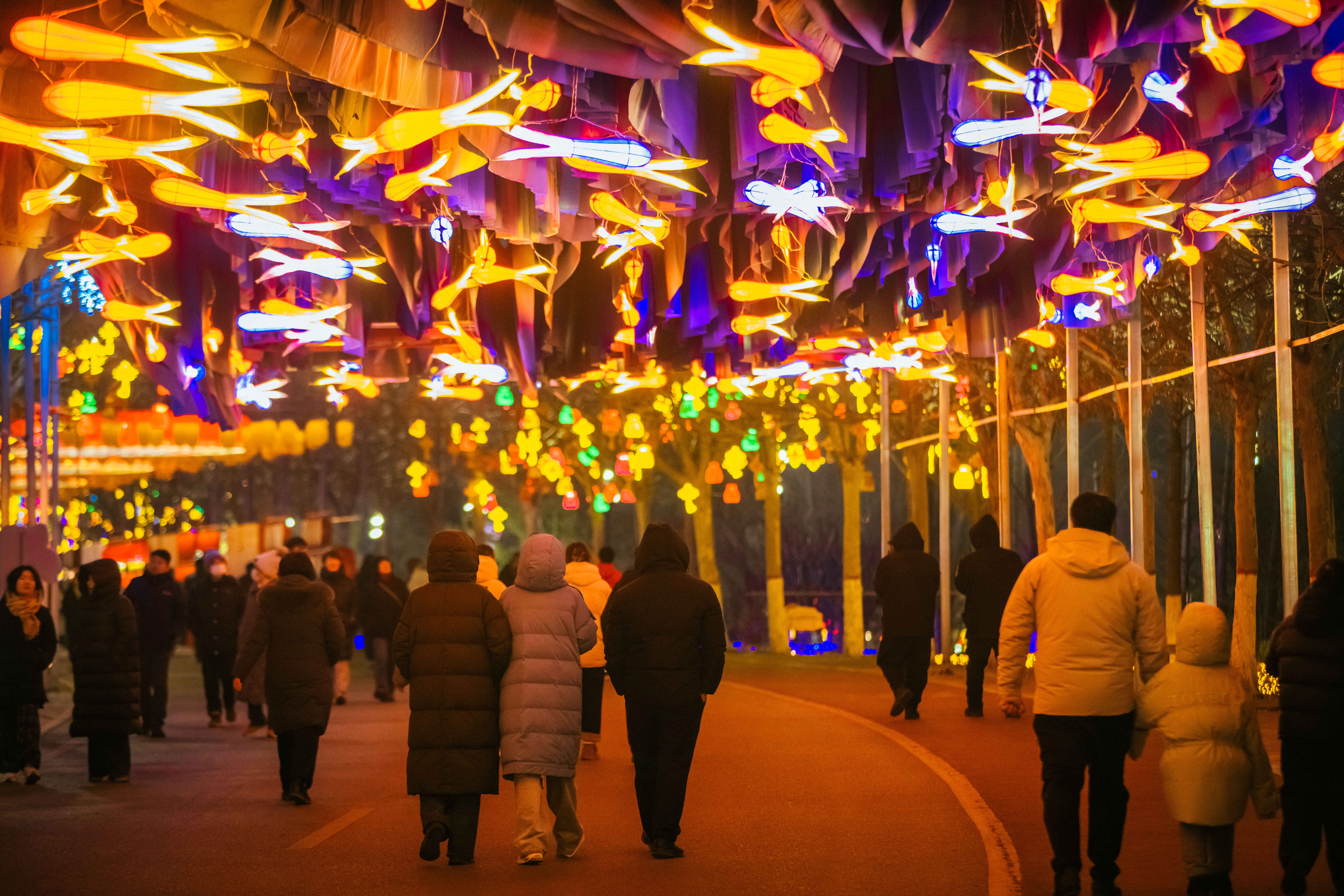 洋溢着浓浓年味儿的魅力唐山主题赏灯区紧扣新春民俗主题,“有鼓气”、姓氏寻根、万家灯火等大型灯组密集呈现,形态各异的游鱼造型、错落排布的大红灯笼、百花齐放的梦幻长廊,让每一位来到这里的游客都能沉浸在团圆喜庆的氛围之中。