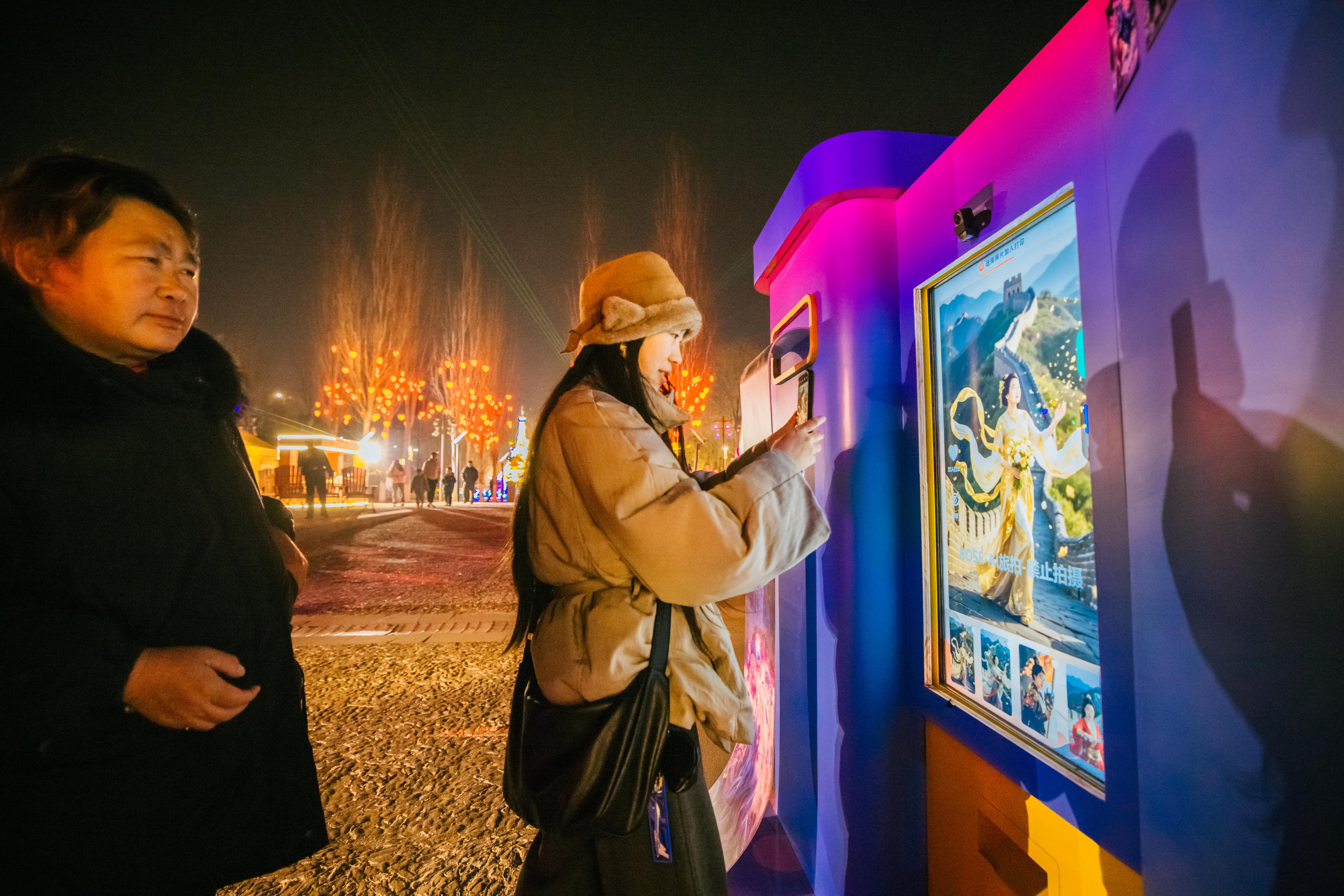 值得一提的是,为丰富游客游玩体验,灯会打破传统灯组静态观赏局限,将AI科技匠心融入灯组之中,为游客带来个性化的赏灯新体验。可爱又不失喜庆的财神驾到灯组前,游客与“财神”实现实时互动聊天,收获满满新春财运祝福。潮玩生肖灯组汇集形态各异的十二生肖形象,游客通过AI交互功能即可测算专属新春运势,解锁个性化运势寄语,成为众多游客打卡祈福的热门点位。赛博时空灯组则主打潮流互动,搭载AI智能换装拍照功能,让游客站实现虚拟服饰换装,一键生成氛围感赏灯大片,轻松定格新春美好瞬间。