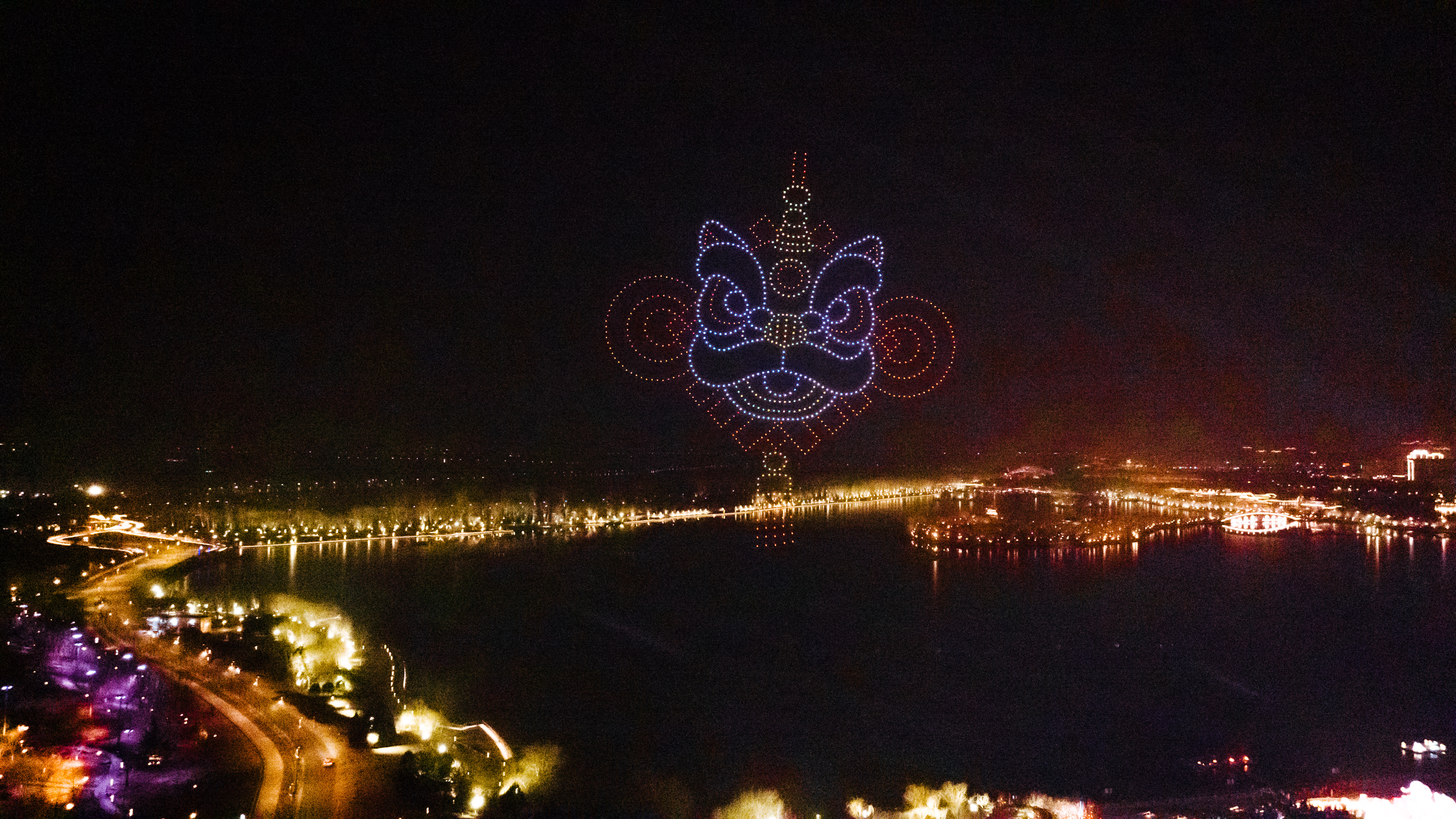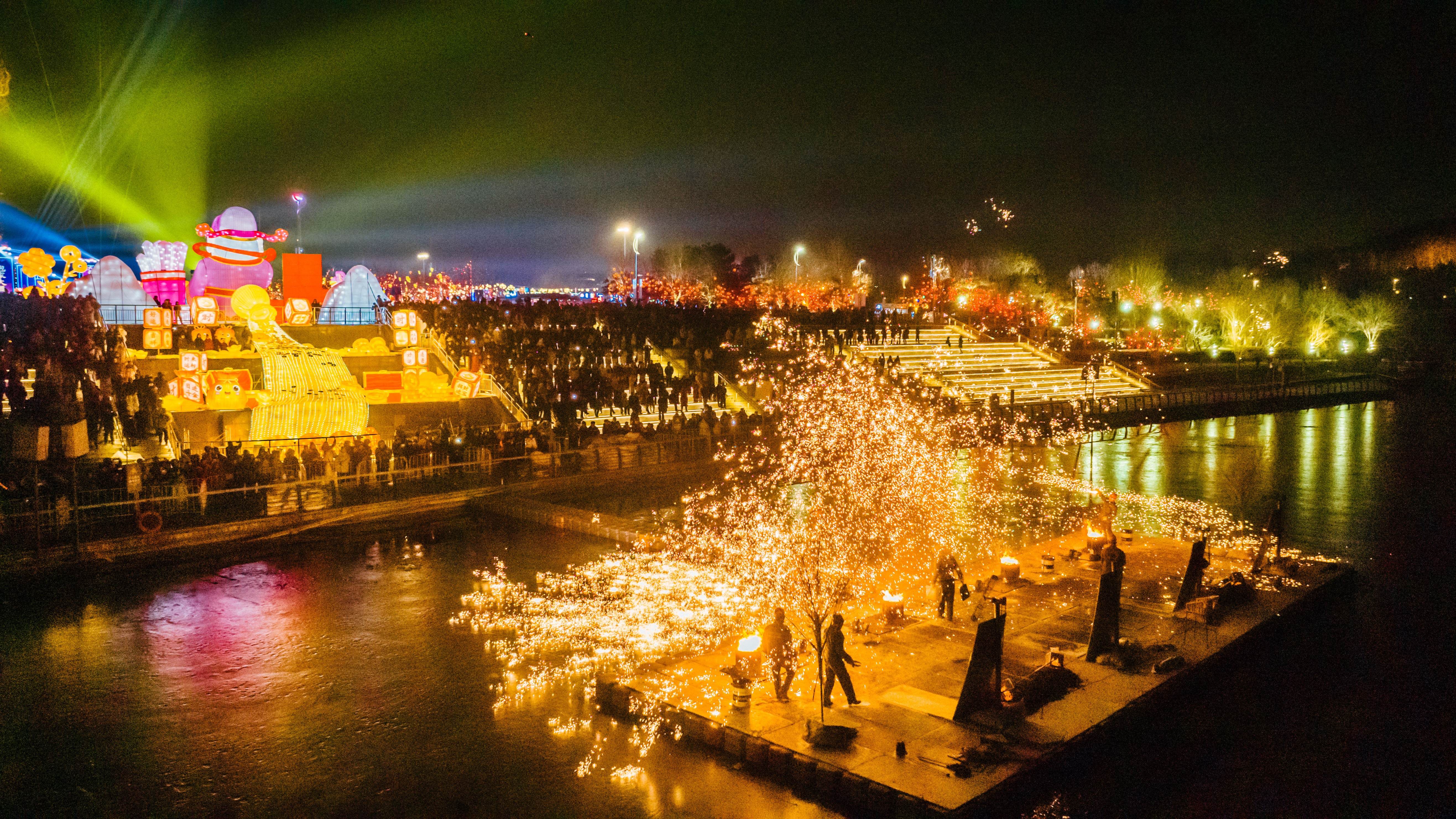 绚烂的灯组间,丰富多彩的演出与互动活动同样让游客不虚此行。每晚准时上演的“激光破晓·华灯启元”灯光秀,以光影为笔,夜空为幕,在声光交织间开启一场流光溢彩、万象启元的沉浸盛典。无人机天幕秀以深邃夜空为画布、璀璨灯光为画笔,震撼演绎“爱你老己”“飞马腾空”“鲤跃龙门”“赛博仙子”“醒狮贺岁”等特色光影图案,配合激昂背景音乐,打造出一场无与伦比的视听盛宴;非遗打铁花在湖面惊艳亮相,铁花飞溅如金蛇狂舞、星火漫天,非遗古韵与新春氛围完美交融,让游客感受传统民俗的极致魅力。麒麟彩车、鳌鱼彩车等主题彩车融合民俗元素与新潮设计,巡游队伍一路欢歌一路游乐,喜庆的氛围游动在灯会各个角落。