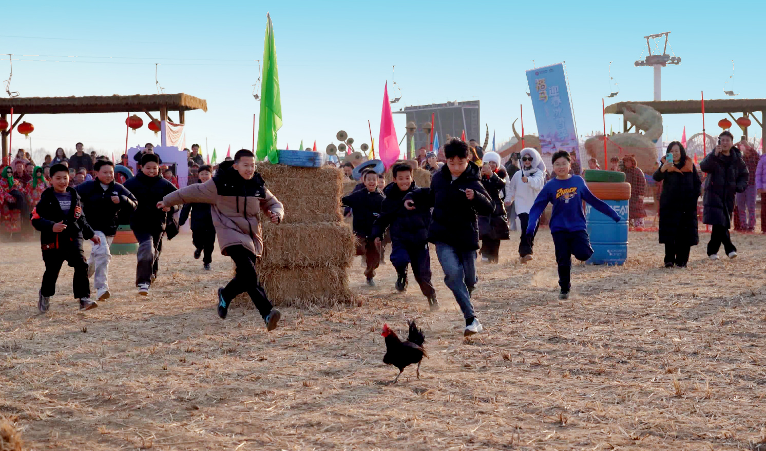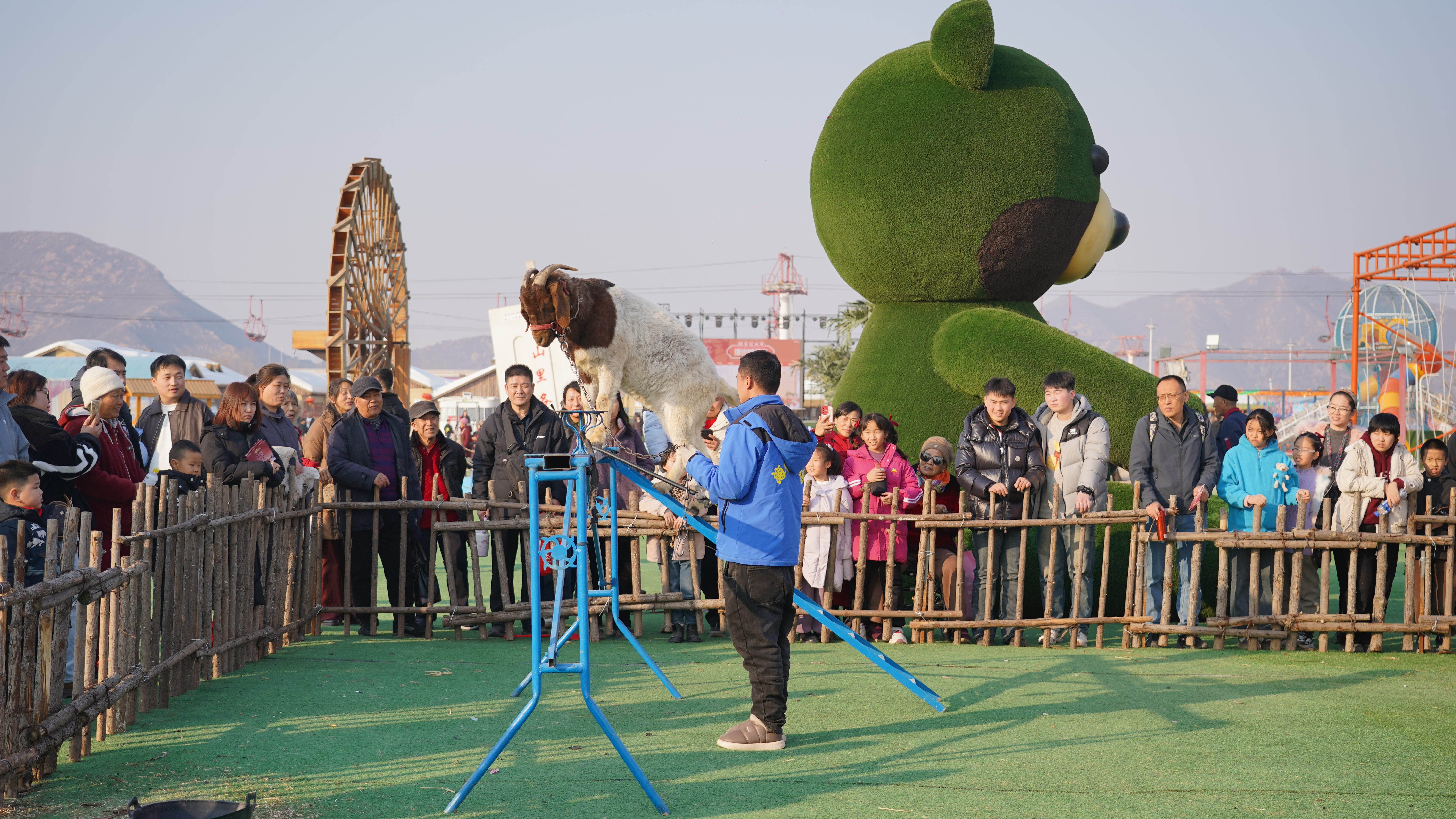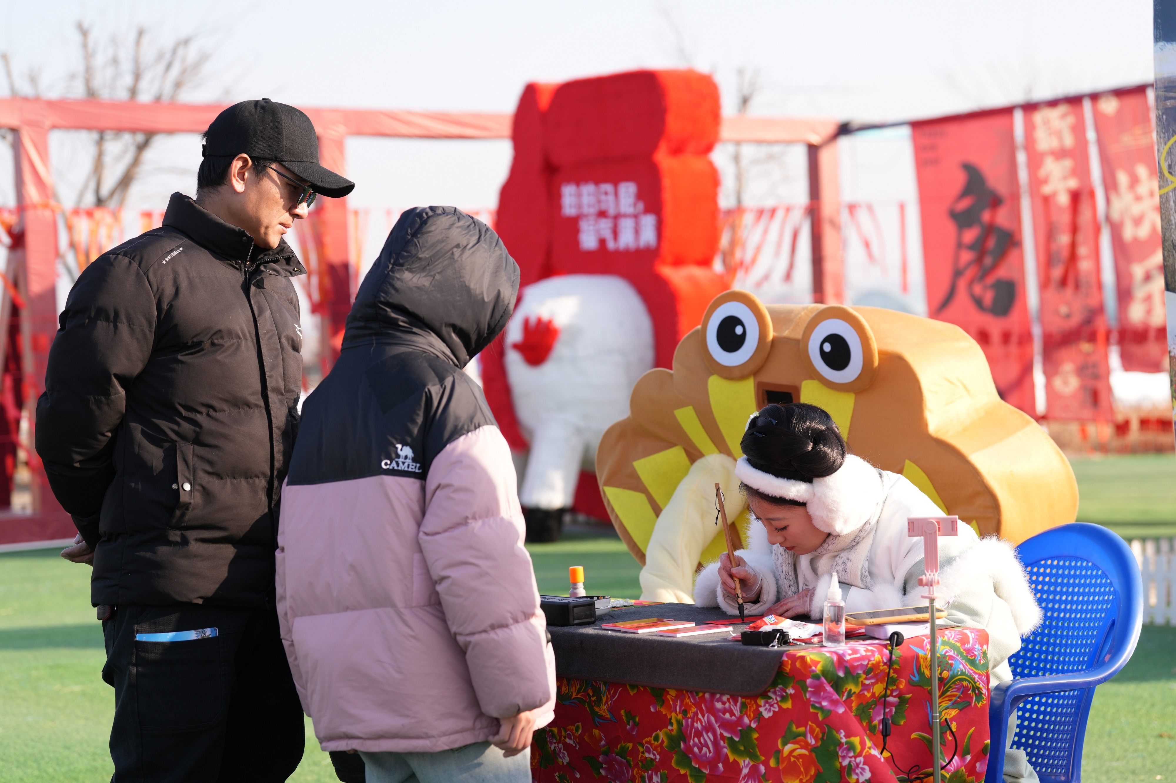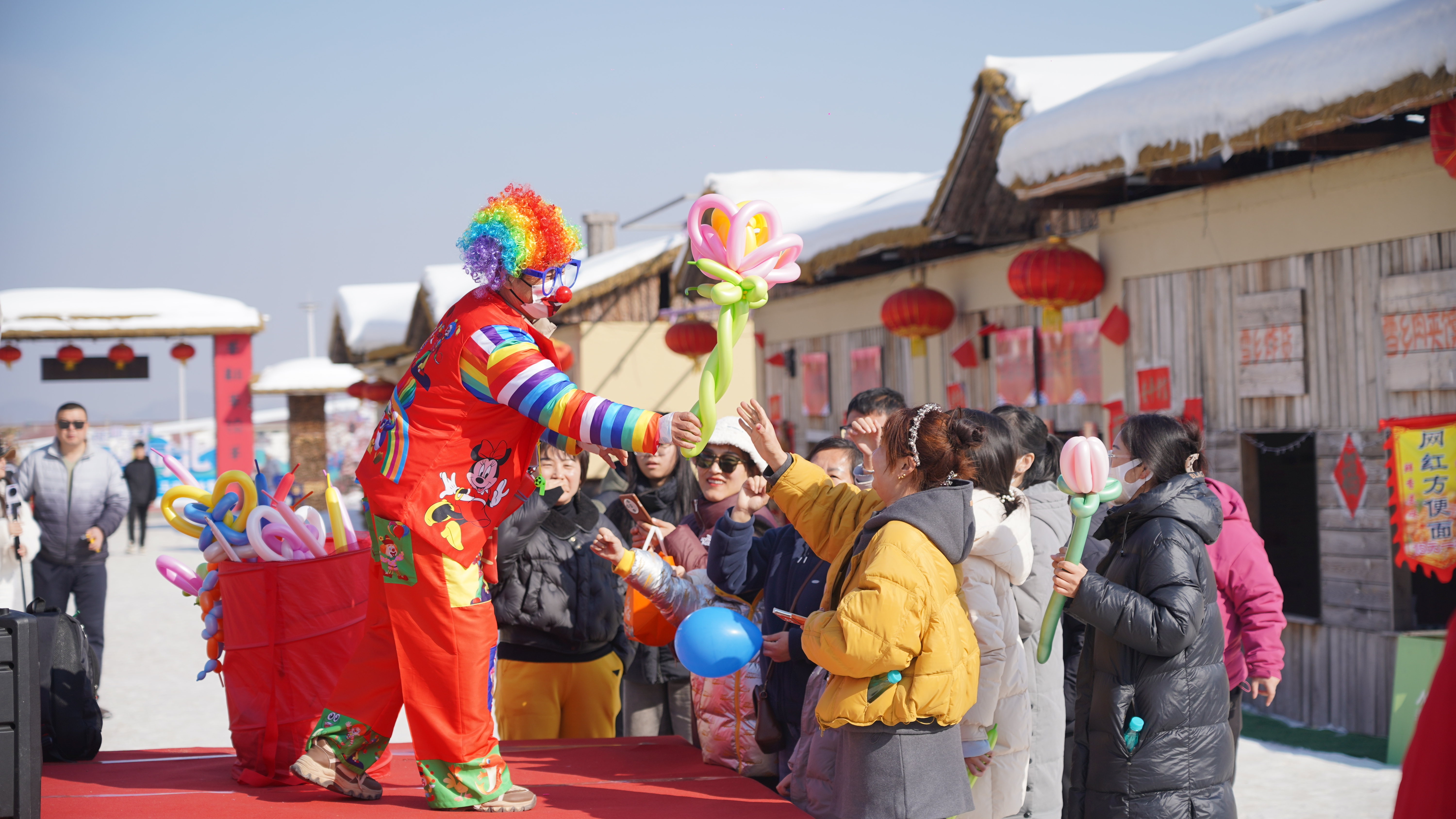 活动现场呈现一派热闹、喜庆的生动景象。十全十美大巡游、极地海狮表演、《嗨!这是山里各庄》演唱会、动物杂技秀、小丑魔术团等精彩演出活力绽放。稻草捉鸡大作战、迷宫寻宝淘年货、雪地糖葫芦大作战等游戏活动趣味横生,欢笑声、呐喊声、加油声交织成片。财神、太上老君、极地因纽特人等众多NPC成为游客镜头里的“顶流”,他们不仅送欢笑、送互动,更把福气与好运送到每位游客手中。